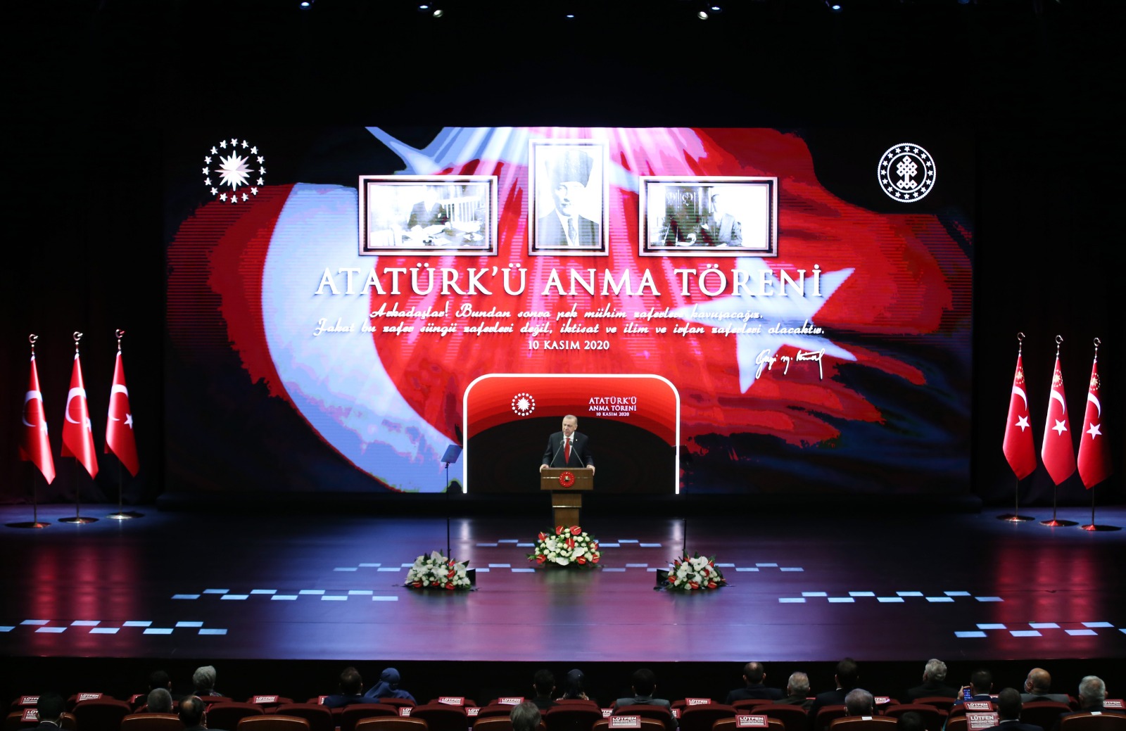 Cumhurbaşkanı Erdoğan, Beştepe Millet Kongre ve Kültür Merkezi'nde Gazi Mustafa Kemal Atatürk'ün ebediyete irtihalinin 82'nci yıl dönümü dolayısıyla Atatürk Kültür, Dil ve Tarih Yüksek Kurumu tarafından düzenlenen anma törenine katıldı.