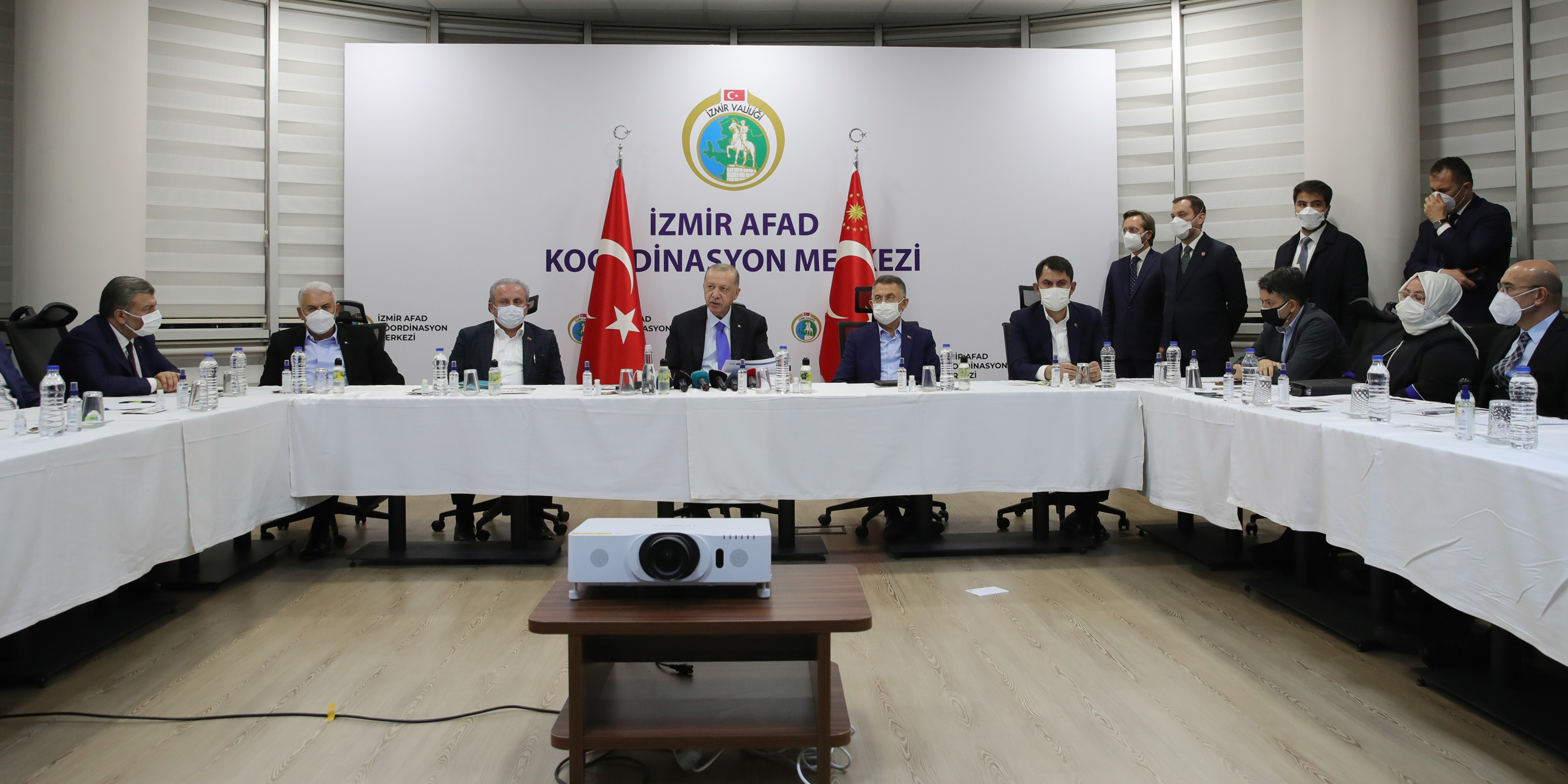 Toplantıda Cumhurbaşkanı Erdoğan'a TBMM Başkanı Mustafa Şentop, Cumhurbaşkanı Yardımcısı Fuat Oktay, Sağlık Bakanı Fahrettin Koca, Çevre ve Şehircilik Bakanı Murat Kurum, Aile, Çalışma ve Sosyal Hizmetler Bakanı Zehra Zümrüt Selçuk, Adalet Bakanı Abdulhamit Gül, Milli Eğitim Bakanı Ziya Selçuk, Tarım ve Orman Bakanı Bekir Pakdemirli, Ulaştırma ve Altyapı Bakanı Adil Karaismailoğlu, Enerji ve Tabii Kaynaklar Bakanı Fatih Dönmez, İçişleri Bakan Yardımcısı İsmail Çataklı, AK Parti Genel Başkan Yardımcısı Mahir Ünal, AK Parti İzmir Milletvekili Binali Yıldırım, AFAD Başkanı Mehmet Güllüoğlu ile Diyanet İşleri Başkanı Ali Erbaş da eşlik etti.