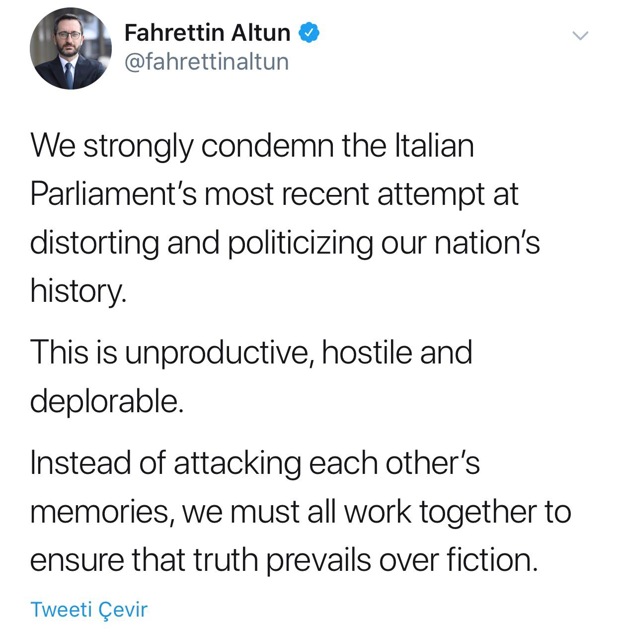 Altun, sosyal medya hesabı Twitter’dan yaptığı paylaşımda, “İtalya Parlamentosu’nun tarihimizi çarpıtma ve politize etme çabasını en sert biçimde kınıyoruz. Bu kısır, düşmanca ve müessif bir yaklaşımdır. Birbirimizin anılarına saldırmak yerine hep birlikte gerçeğin hikayelere üstün gelmesini sağlamalıyız.” İfadelerini kullandı.